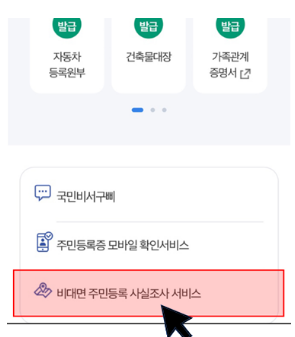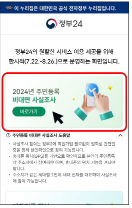 - 비대면 사실조사 메뉴 접속: 앱 실행 후, 메인 화면에서 '2024년 주민등록 비대면 사실조사' 배너를 클릭합니다.